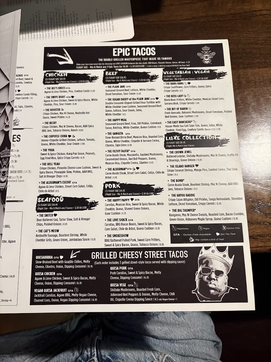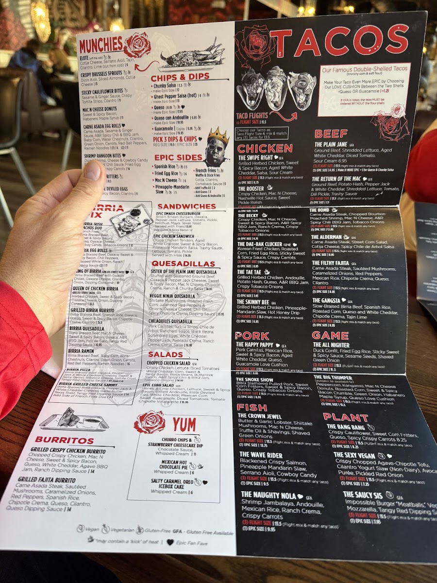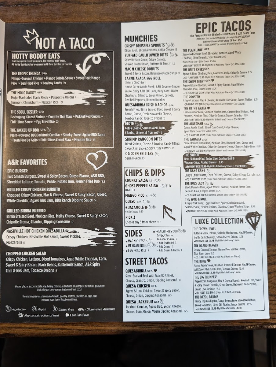 Herbed Chicken, Sweet & Spicy Bacon, Aged White Cheddar, Salsa, Sour Cream (GF) *If Gluten Free (GF) is listed with the EPIC Taco, it MUST be ordered WITHOUT the Flour Shell
