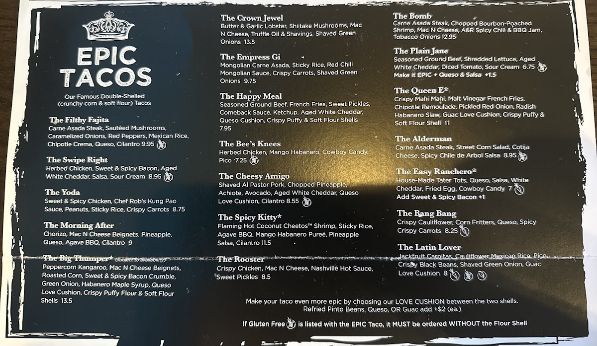 Seasoned Ground Beef, Shredded Lettuce, Aged White Cheddar, Diced Tomato, Sour Cream (GF) *If Gluten Free (GF) is listed with the EPIC Taco, it MUST be ordered WITHOUT the Flour Shell